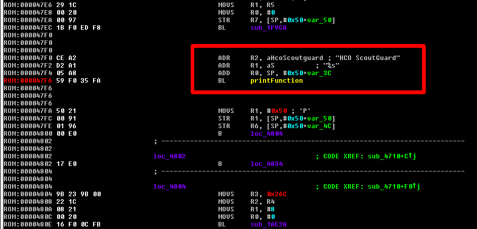 A quick google for "scoutguard firmware" lead to this page which contained a link to an updated firmware package and install instructions. Excellent. The firmware wasn't even packaged, it was just the raw binary blob and it loaded up perfectly in IDA. Tracking down the offending code was just a case of finding the cross reference to the ScoutGuard string.